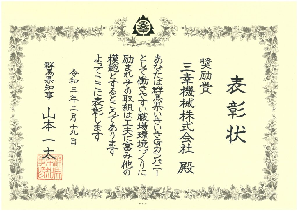 令和2年度群馬県いきいきGカンパニー優良事業所 2021年2月19日 最終更新日時 : 2024年8月28日 wpmaster 2021年2月19日、弊社が「令和2年度群馬県いきいきGカンパニー優良事業所」表彰において、奨励賞を受賞いたしました。 外部サイト:「群馬県いきいきGカンパニー」優良事業所表彰および優良取組事例集について