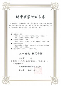 国が推奨する「健康経営」の趣旨の下、協会けんぽが事業所と連携した健康づくりの取組の一つである「健康事業所宣言」を弊社でも行いました。