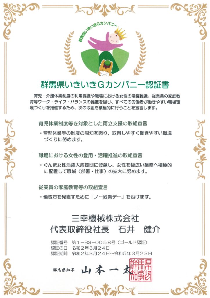群馬県いきいきGカンパニー ゴールド認証 2020年3月24日 最終更新日時 : 2024年8月28日 wpmaster 以前より認証されておりました「群馬県いきいきGカンパニー」が、ゴールド認証になりました。引き続き、働きやすい職場づくりに努めて参ります。 外部サイト:群馬県『群馬県いきいきGカンパニー認証制度』