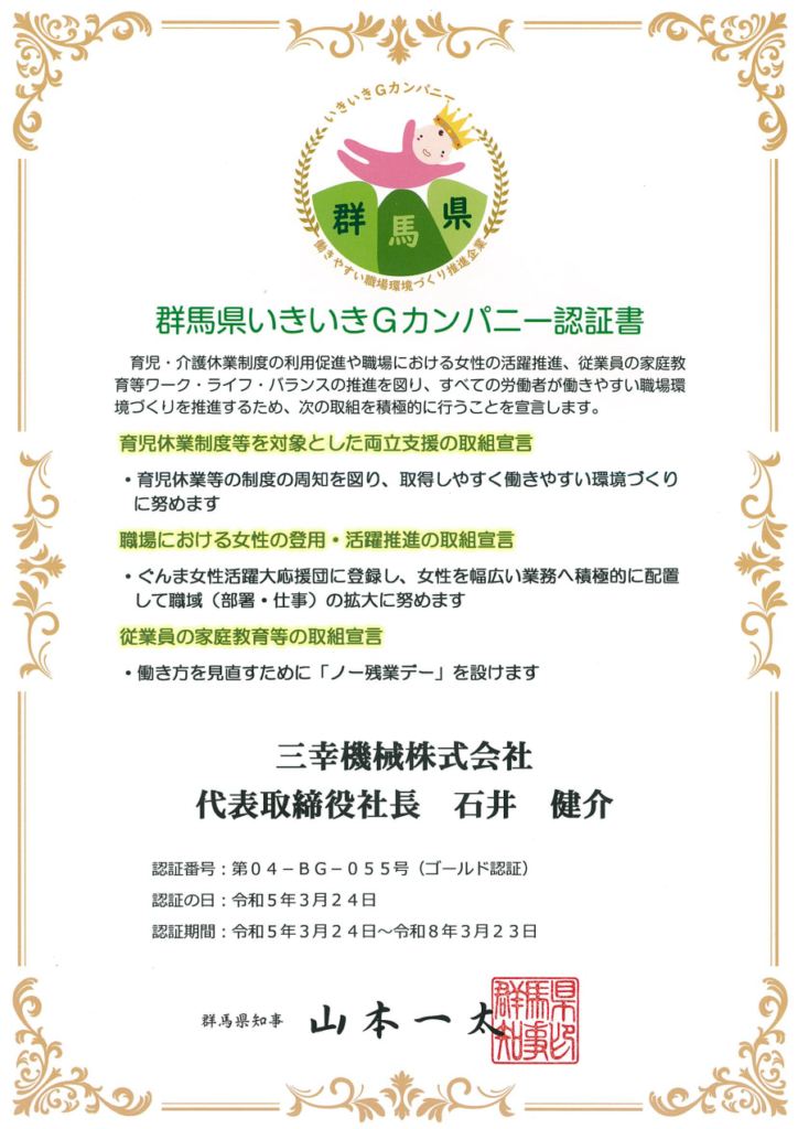 令和5年3月24日、弊社が「群馬県いきいきGカンパニー」のゴールド認証を再び頂きました。
