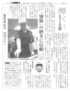 2016年9月28日(水)の上毛新聞(群馬県内最大の発行部数を誇る地方新聞)『輝く現場の女性たち』というコーナーにて弊社「生産五部」の松本任由さんが取り上げられました。